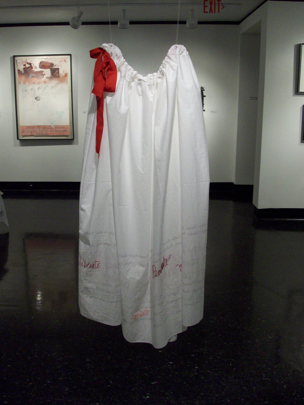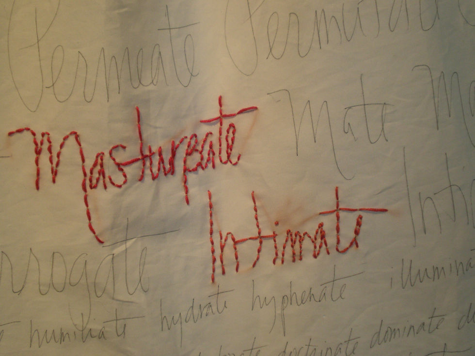 This fabric sculpture is based upon rhyming text submitted by over 30 people which was then written and embroidered on a petticoat. The idea being whether your poetry is good or bad, if you rhyme well or rhyme enough, a woman will lift her skirt. It’s persistence. It’s the comfort of knowing that something continues to repeat itself. So although modern poetry sometimes spurns iambic pentameter and the couplet, there is something to be said of the quiet maneuvering of similar words that hypnotize and mesmerize.